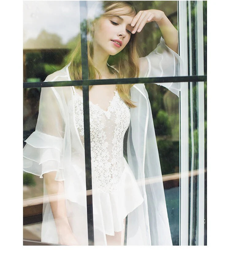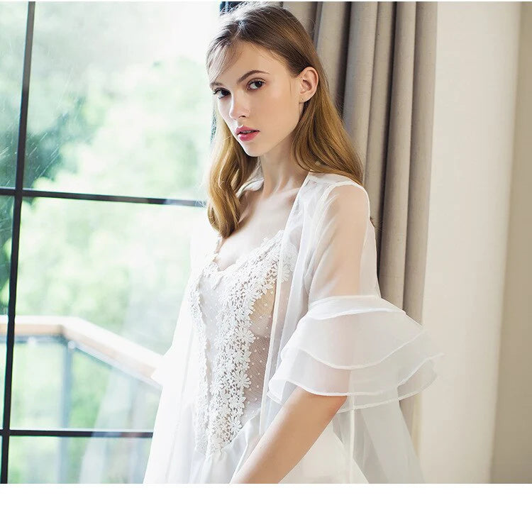 Tämä kaunis hääyöpaita on suunniteltu tekemään hääyöstäsi täydellinen. Ylellisen pehmeä ja läpikuultava asu koostuu upeasta pitsikoristelusta alusasussa ja ilmavasta, keijukaismaisen kevyestä kaavusta, joka liikkuu kanssasi kuin unelma. Tämä ei ole vain vaate – se on kokemus, joka tekee elämäsi tärkeimmästä illasta vieläkin taianomaisen. Läpikuultava materiaali on samaan aikaan viettelevä ja hienostunut, antaen sinulle juuri oikean tasapainon eleganssia ja sensuaalisuutta. Jokainen yksityiskohta on suunniteltu huolella, pitsikoristelusta röyhelöityihin hihansuihin, luoden täydellisen kokonaisuuden, joka saa sinut tuntemaan itsesi uskomattoman kauniiksi.