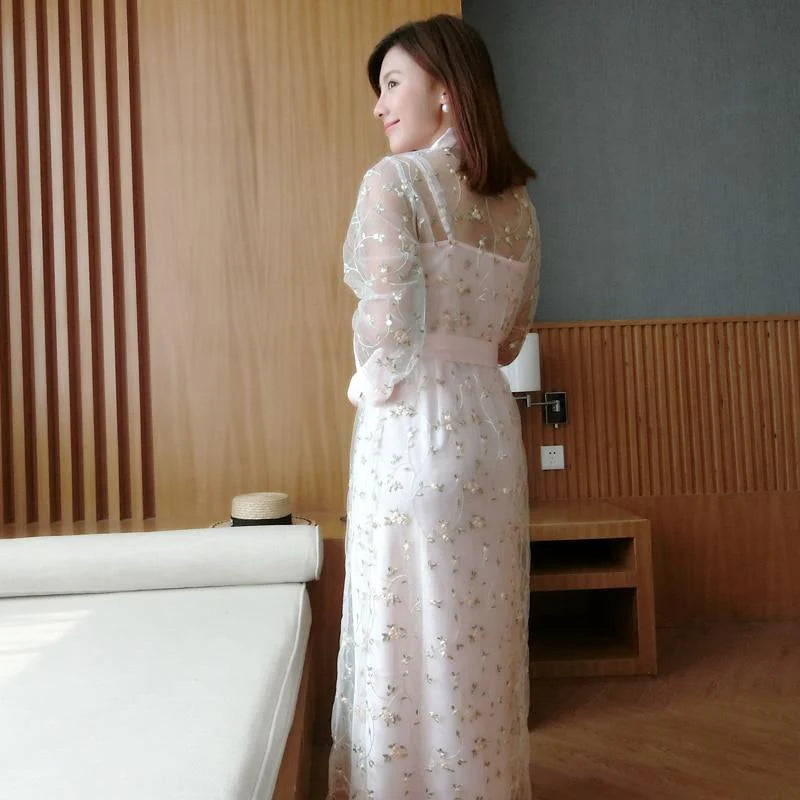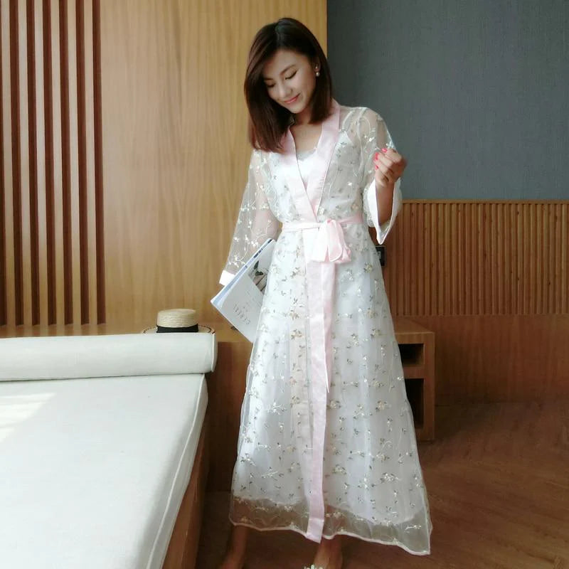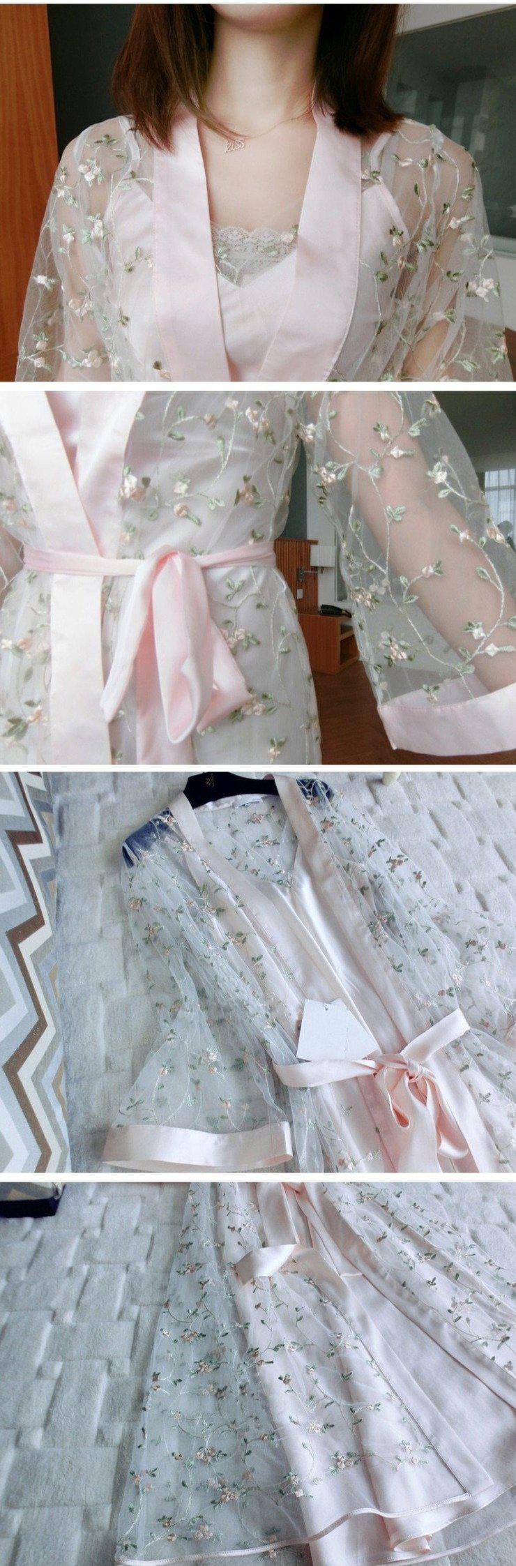 Koe täydellinen rentoutuminen tällä ilmavalla ja herkän romanttisella japanese sleeping kimono -aamutakilla. Läpikuultava tylli, kaunis kukkakuviointi ja pehmeä satiininauha tekevät tästä kimonosta täydellisen valinnan itsensä hemmotteluun aamukahvin äärellä tai rauhallisiin iltoihin kotona. Valmistettu kevyestä, hengittävästä materiaalista, tämä kimono tuntuu iholla kuin hellä hyväily ja saa sinut tuntemaan olosi sekä tyylikkääksi että mukavaksi. Jokainen yksityiskohta on tarkkaan harkittu, jotta aamun ensimmäiset hetket tai illan viimeiset tunnit olisivat täydellisen rentouttavia.