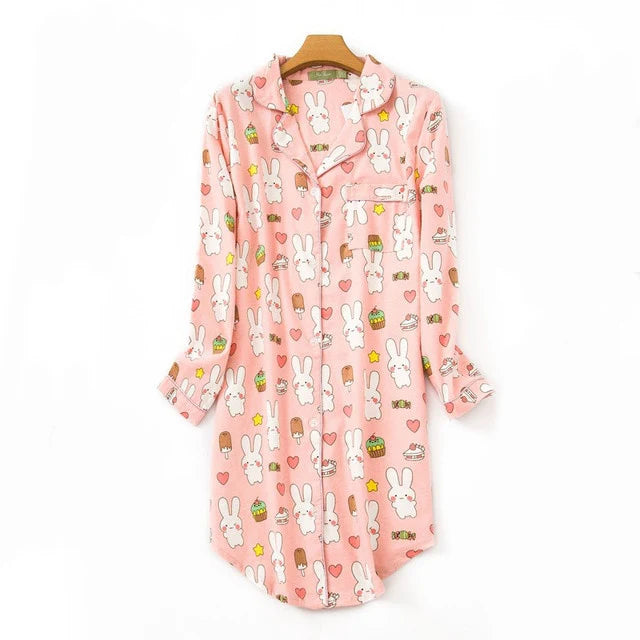 Sukella suloiseen uneen tässä leikkisässä Kitsch Yöpaidassa, joka on täydellinen valinta kaikille söpöjen pupujen ystäville! Vaaleanpunainen yöpaita on koristeltu suloisten valkoisten pupuhahmojen, värikkäiden kuppikakkujen, jäätelöiden ja sydämien kuviolla – täydellinen tapa tuoda ripaus iloa ja leikkisyyttä yöpukeutumiseesi. Jokainen ilta tuntuu heti paremmalta, kun puet tämän mukavan yöpaidan päällesi. Valmistettu pehmeästä puuvillasta, se hemmottelee ihoasi koko yön ajan ja pitää sinut mukavassa lämmössä ilman hikoilua. Kauluspaidan tyylinen leikkaus tekee siitä sekä trendikkään että käytännöllisen, ja pidempi pituus tarjoaa täydellisen suojan viileämpinä öinä.