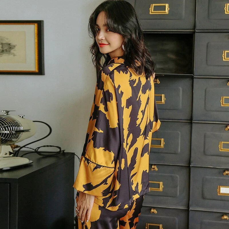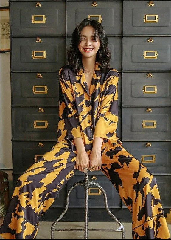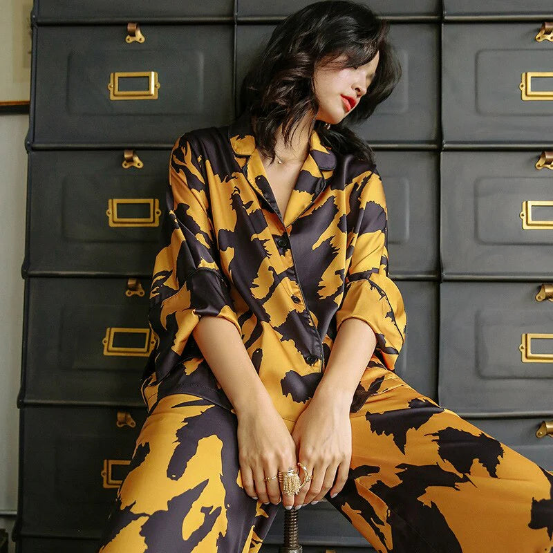 Ylellinen Musta ja Oranssi Kuviollinen Pyjama - Tyylikkäin Valinta Rentoutumiseen
