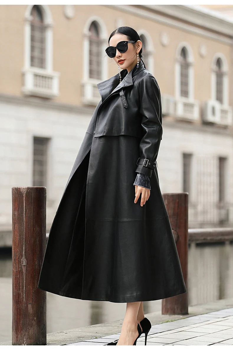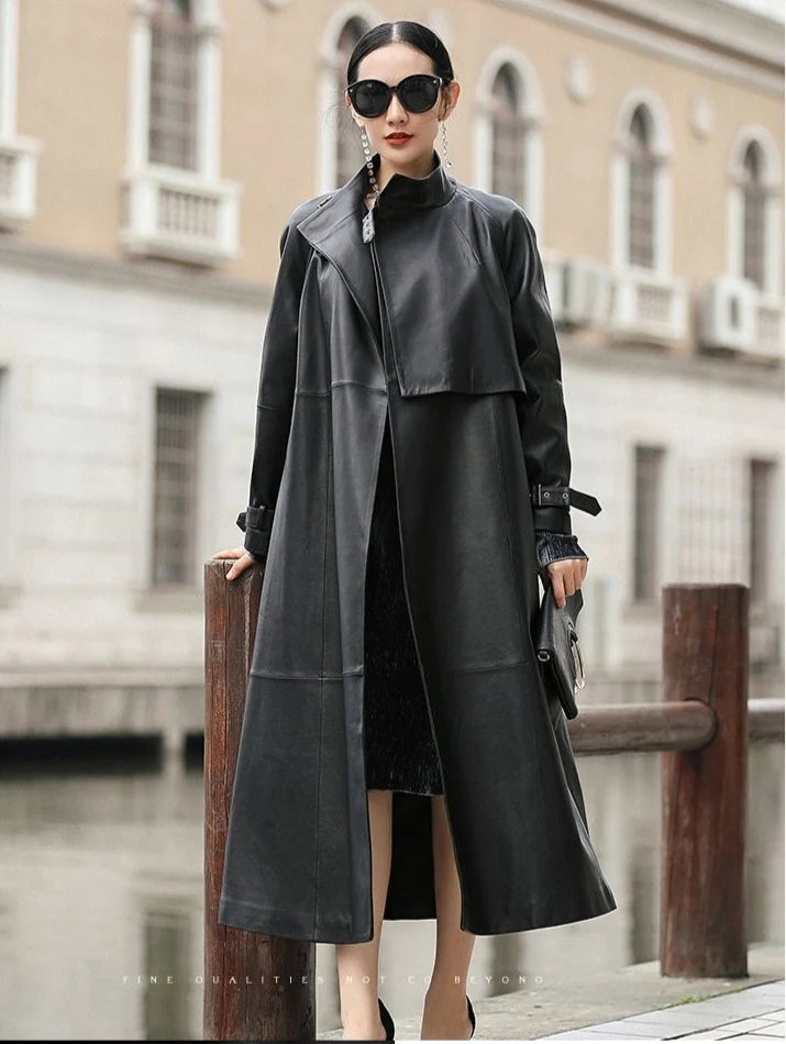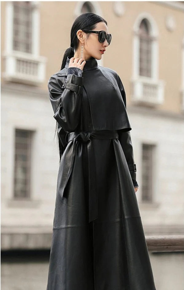 Tämä laadukas musta kaaputakki on valmistettu pehmeästä aidosta nahasta, joka säilyttää muotonsa ja kauneutensa vuosien ajan. Kun puet tämän ylleen, tunnet välittömästi itsesi tyylikkääksi ja itsevarmaksi. Näyttävä A-linjainen siluetti ja vyötäröä korostava vyö luovat naisellisen ja ajattoman ilmeen, joka toimii yhtä hyvin Helsingin keskustan kaduilla kuin iltatilaisuuksissa. Pehmeä nahka mukautuu liikkeisiisi tehden tästä kaaputakista uskomattoman mukavan käyttää päivästä toiseen, vaikka ulkona olisi viileää. Tämä ei ole vain takki – se on sijoitus tyyliin, joka kestää aikaa ja trendejä.