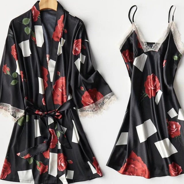 Kokemasi Arjen Luksus Musta Kukallinen Satiini Kimono Mekko -setin Muodossa