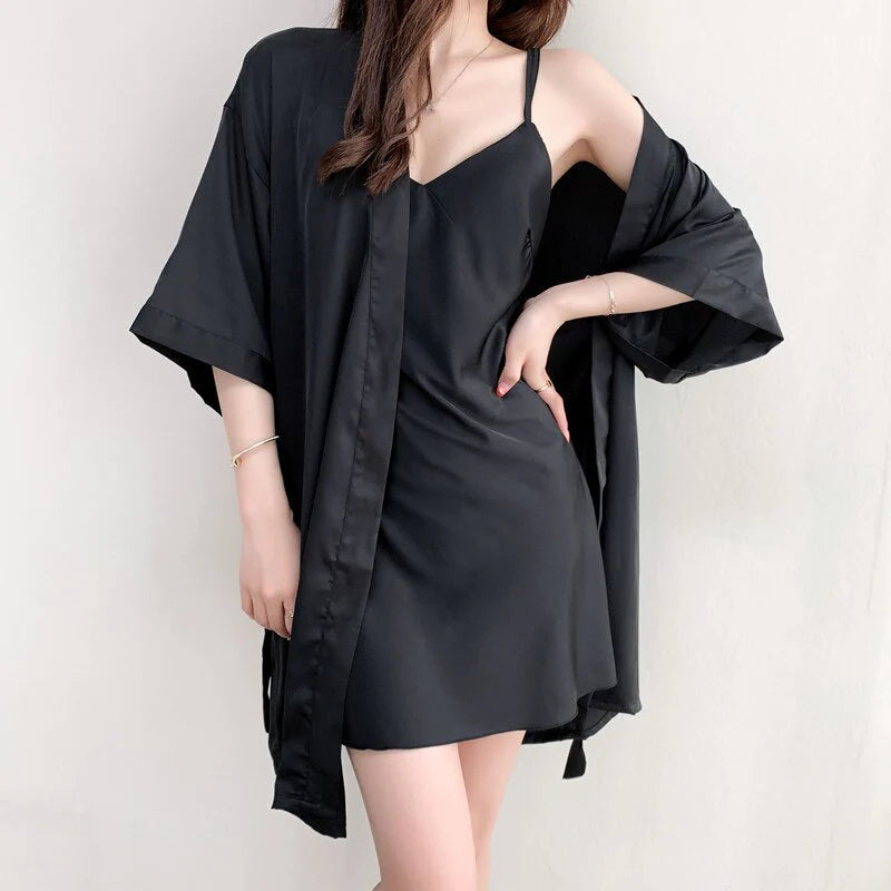 Anna itsellesi lupaus luksuksesta arjen keskellä tällä upealla mustalla satiini kimono mekolla. Tämä kaksiosainen setti on suunniteltu juuri sinulle, joka arvostat sekä tyylikkyyttä että mukavuutta. Ylellinen satiinimateriaali hyväilee ihoasi pehmeällä kosketuksellaan, samalla kun mekko ja kimono yhdistelmä tarjoaa monipuolisia käyttömahdollisuuksia. Tunne itsesi hemmotelluksi heti herättyäsi tai viettäessäsi rentouttavaa iltaa kotona. Satiinin hienovarainen kiilto korostaa tyylikästä silhuettiasi ja ristiselkäinen design tuo sekä mukavuutta että ripauksen sensuaalisuutta jokaiseen liikkeeseesi.