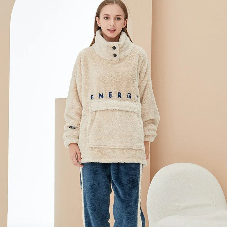 Unohda tavalliset yöasut - tämä ihastuttava Naisten Talvi Fleece Pyjama tarjoaa sinulle sellaisen lämmön ja mukavuuden, jota et ole aiemmin kokenut. Pehmeä "ENERGY"-tekstillä varustettu fleecepusero ja sointuvat siniset housut luovat täydellisen yhdistelmän tyyliä ja mukavuutta. Korkea kaulus ja kaksoisnapitus antavat mahdollisuuden säätää lämpöä juuri sopivaksi, kun käperryt sohvalle lempikirjasi tai sarjasi pariin. Tämä pyjama ei ole pelkkä yöasu – se on pehmeä syleily, joka saa sinut tuntemaan olosi kotoisaksi heti sen puettuasi.