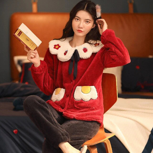 Kuvittele itsesi kääriytyneenä äärimmäisen pehmeään, lämpimään syleilyyn kylmänä talvi-iltana. Tämä hurmaava vintage-tyylinen pyjamamme on valmistettu ylellisestä pilou-pilou -materiaalista, joka on tunnettu poikkeuksellisesta pehmeydestään ja lämmöstään. Ihastu söpöön kaulukseen, jota koristavat ihanat kukka- ja leppäkerttuapplikaatiot sekä hauskoihin paistettua munaa muistuttaviin taskuihin. Jokainen yksityiskohta on suunniteltu tuomaan hymyn huulillesi ja lämpöä ihollesi. Tämä ei ole vain pyjama – se on päivittäinen hemmotteluhetki, jota odotat innolla koko päivän.