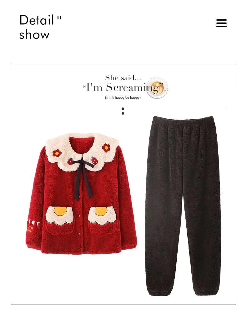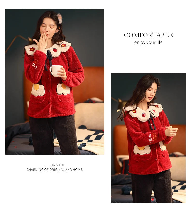 Meillä kaikilla on hetkiä, jolloin kaipaamme vain omaa rauhaa ja mukavuutta. Naisten vintage pehmoinen pyjamamme on vastaus tähän kaipuuseen. Kirkkaanpunainen, pehmoinen takki ja mukavat tummat housut muodostavat täydellisen kokonaisuuden, joka yhdistää leikkisän designin ja käytännöllisen mukavuuden. Korkealaatuinen pilou-materiaali pitää sinut lämpimänä kylmimpinäkin öinä, mutta hengittää juuri sopivasti, jotta et tunne oloasi tukalaksi. Söpöt yksityiskohdat kuten kukka- ja leppäkerttukoristeinen kaulus, muna-applikoidut taskut ja näppärät napit tekevät tästä pyjamasta niin vastustamattoman, että haluat pukea sen yllesi heti kotiin saapuessasi.