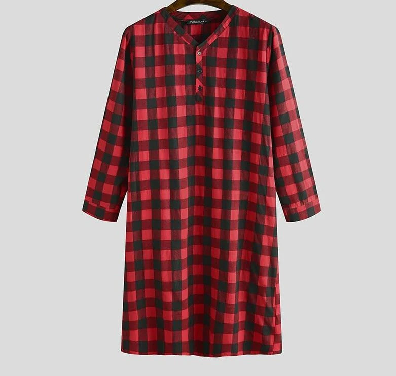 Tämän yöpaidan tyylikäs v-kaula-aukko ei ole pelkästään trendikäs vaan myös käytännöllinen - se tekee pukemisesta ja riisumisesta vaivatonta. Pitkät hihat tarjoavat juuri sopivasti suojaa viileämpinä öinä, ja vahvistetut saumat takaavat, että vaate kestää yö toisensa jälkeen. Punamustan ruutuisen kankaan laatu näkyy sen kestävyydessä - se säilyttää värinsä ja muotonsa pesujen jälkeenkin. Yöpaita ulottuu polvien alapuolelle, tarjoten täydellisen peiton ilman rajoittavaa tunnetta. Napeilla varustettu etukappale antaa sinulle mahdollisuuden säätää kaula-aukkoa mieltymystesi mukaan.
