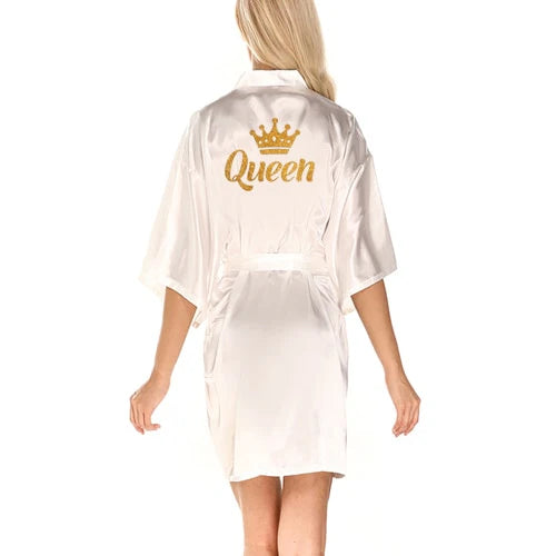 Tunne itsesi kuningattareksi joka päivä tyylikkäässä Queen Kimonossa, joka on luotu juuri sinulle. Tämä silkinpehmeä satiinista valmistettu kimono hyväilee ihoasi kuin kuninkaallinen halausta, tarjoten täydellistä mukavuutta ja eleganssia mihin tahansa hetkeen. Kaunis kultainen kruunukuviointi ja Queen-teksti kimonon selkäpuolella on suunniteltu herättämään itsevarmuutta ja arvokkuutta - olet ansainnut tulla kohdelluksi kuin kuningatar. Oli kyseessä sitten hääaamu, spa-päivä, rento viikonloppu tai erityinen ilta, tämä valkoinen Queen Kimono on täydellinen valinta, joka tekee tavallisistakin hetkistä erityisiä.