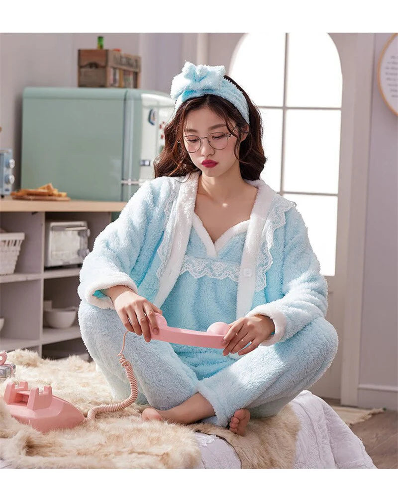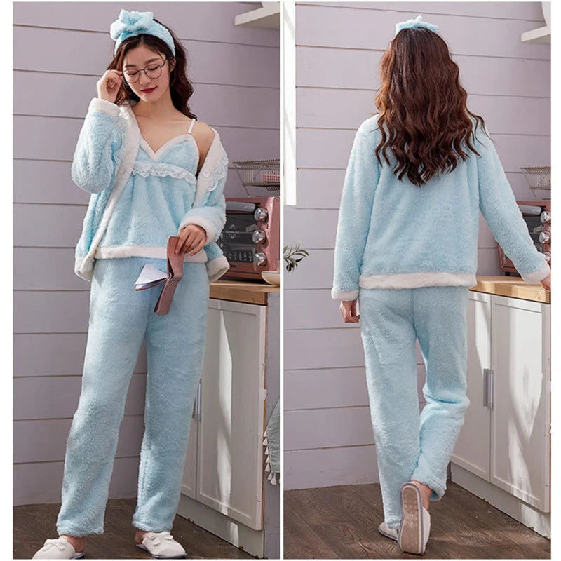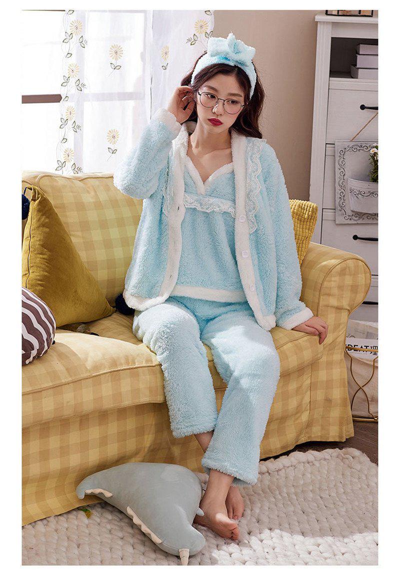 Toisin kuin tavalliset yöasut, Sininen Pehmoinen Pyjamamme tarjoaa ylivertaista lämpöä ilman painon tunnetta. Huolellisesti valittu pilou-kangas tuntuu uskomattoman pehmeältä ihoa vasten ja säilyttää lämmön kylminäkin öinä. Kolmiosainen setti (takki, toppi ja housut) antaa sinulle vapauden valita juuri oikean yhdistelmän lämpötilan mukaan. Pitsikoristeiset reunat ja söpö hiuspanta tekevät tästä setistä täydellisen lahjan itsellesi tai rakkaallesi. Parasta kaikessa on, että tämä pyjama säilyttää pehmeytensä pesusta toiseen, joten voit nauttia sen ylellisestä tunteesta vuodesta toiseen.