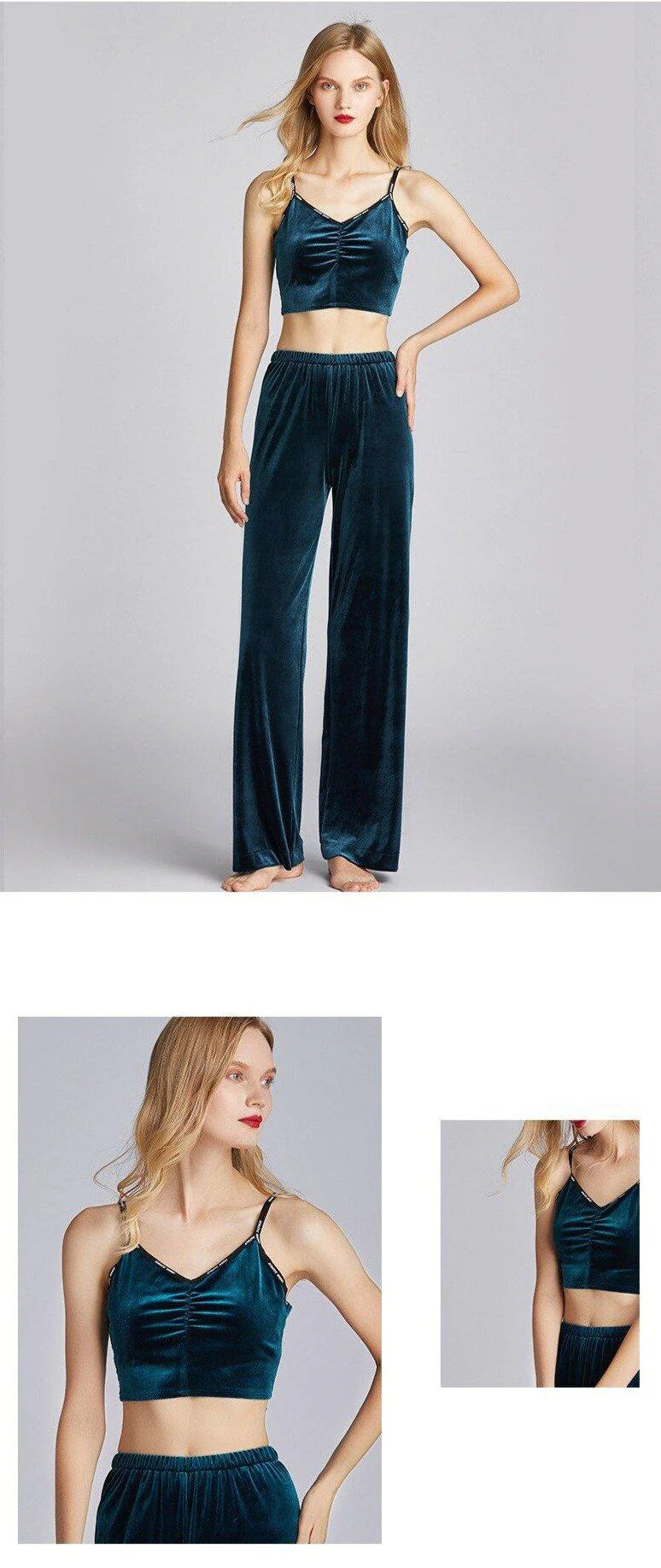 Tämä samettipyjama ei ole kuten mikään muu yöasu markkinoilla. Käsin valitut materiaalit takaavat, että jokainen senttimetri tuntuu iholla täydelliseltä. Ylellinen samettikangas heijastaa valoa hienostuneesti, luoden syvän, loistokkaan sinisen sävyn, joka muuttuu liikkuessasi. Elastinen vyötärönauha tekee housuista vaivattoman mukavat ja ne istuvat täydellisesti kaikille vartalotyypeille. Toppi on suunniteltu hienostuneella V-kaula-aukolla, joka korostaa siroja olkapäitä ja avain-selkää kauniisti. Ohuet säädettävät olkaimet varmistavat täydellisen istuvuuden. Tämä sininen samettipyjama on suunniteltu kestämään – laatumateriaali säilyttää pehmeytensä ja värinsä pesujen jälkeenkin, kun noudatat hoito-ohjeita. Nauti pyjamasta, joka on sekä käytännöllinen että niin kaunis, että et halua poistua makuuhuoneestasi.