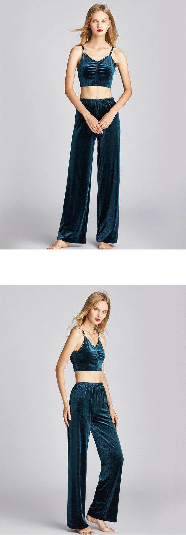 Kuvittele itsesi kietoutuneena pehmeään, ylelliseen samettimateriaaliin, joka hyväilee ihoasi kuin silkki. Tämä syvän merensininen samettipyjama ei ole vain nukkumisasu – se on kokemus. Jokainen yksityiskohta on suunniteltu tarjoamaan sinulle täydellinen yhdistelmä ylellisyyttä ja mukavuutta. Syvä, samettimainen sininen sävy ei ainoastaan näytä upealta, vaan tuntuu myös ihollasi uskomattoman pehmeältä ja ylelliseltä. Tämä kaksiosainen pyjama koostuu tyylikkäästä topista ohuilla säädettävillä olkaimilla sekä mukavista, väljistä housuista, jotka antavat iholle tilaa hengittää yön aikana. Pyjama on suunniteltu sinulle, joka arvostat sekä tyylikkyyttä että käytännöllisyyttä – jopa nukkuessasi.