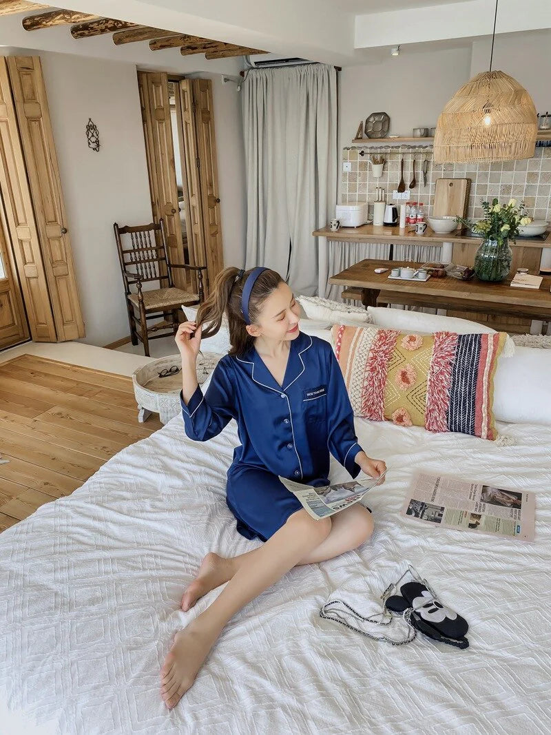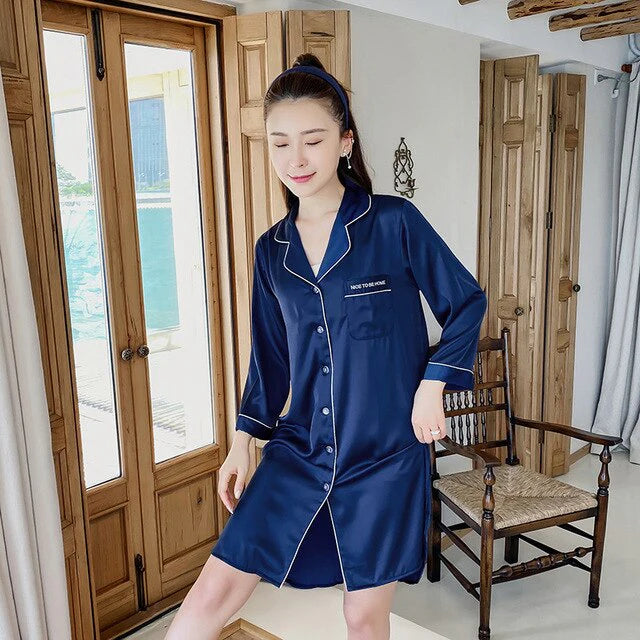 Sukella pehmeään uneen ylellisessä yönsinisessä yöpaidassamme, joka on suunniteltu juuri sinulle, joka arvostat sekä tyyliä että mukavuutta. Tämä klassinen paitamallinen yöpaita on valmistettu huippulaatuisesta silkinkaltaisesta materiaalista, joka hyväilee ihoasi kuin pehmeä tuulenvire. Raikkaan sininen sävy ja tyylikkäät valkoiset reunukset luovat ajattoman eleganssin, joka saa sinut tuntemaan olosi hemmotelluksi nukkumaan mennessäsi ja herätessäsi. Löysä leikkaus tarjoaa täydellisen liikkumavapauden, joten et tunne oloasi koskaan rajoitetuksi yön aikana. Olipa kyseessä rauhallinen viikonloppuaamu lehden parissa tai unelias ilta makuuhuoneen rauhassa, yönsininen yöpaitamme on täydellinen kumppani rentoutumishetkiisi.